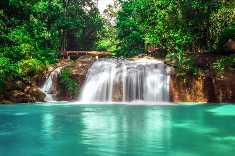 Bua Thong Waterfall, or the “Sticky Waterfall,” in Chiang Mai is a unique limestone cascade with a grippy calcium-rich surface, allowing visitors to climb its natural steps with ease.