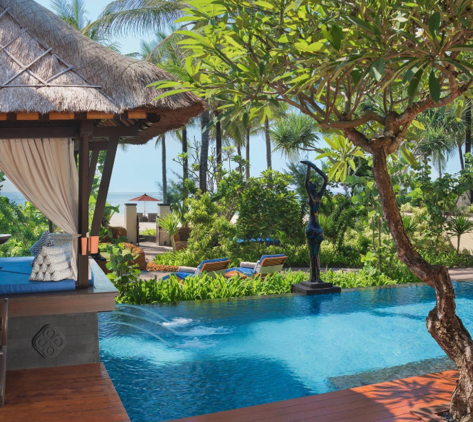 - The St. Regis Bali Resort – This luxury resort offers butler service, 24-hour fitness center, private beach, spa services, on-site dining, and an outdoor pool.