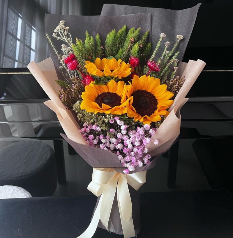 Description : This hamper features a selection of premium teas, dried fruits, and nuts, as well as festive Chinese New Year decorations, such as a red lantern and a golden auspicious character. Instagram: @herflowerssg Opening hours: Monday-Sunday, 8am-10pm