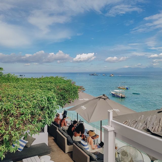 A beach club on Ceningan Island offers stunning ocean views. They serve delicious food and cocktails. Sunbeds and umbrellas are available for guests.